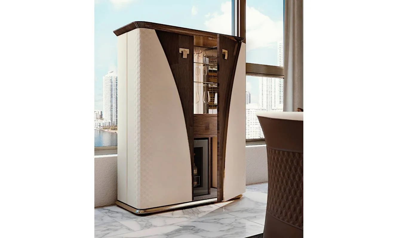 Барный шкаф с холодильником. Выполнен из дерева, частично обит кожей. Внутри два ящика и стеклянные полки. Возможны другие отделки. Возможен заказ шкафа без барных полок и холодильника.