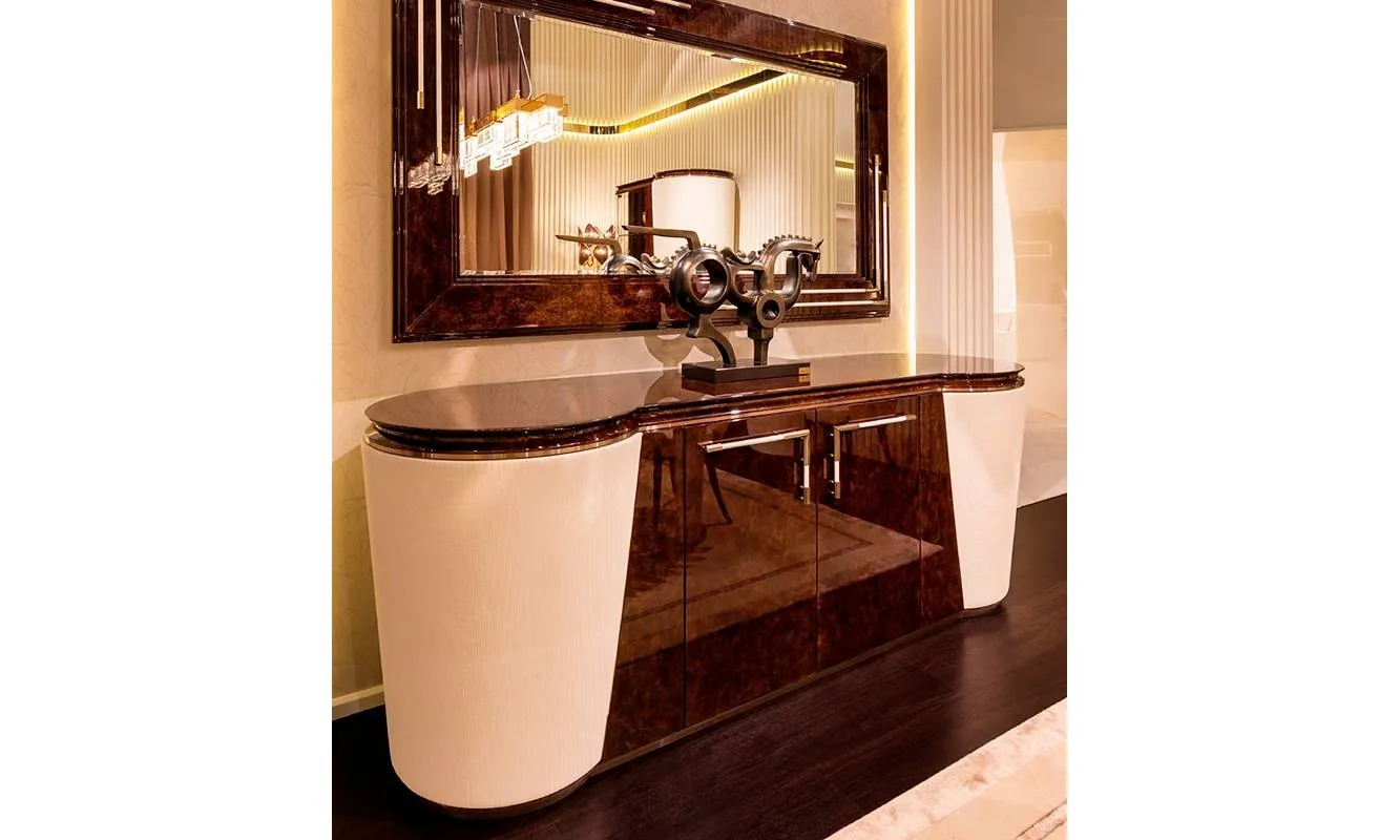 Буфет со структурой из дерева. Имеет два вращающихся элемента, обитых кожей. Ручки выполнены из металла. Возможны иные виды обивки и отделки. Возможно выполнение изделия с ящиками.