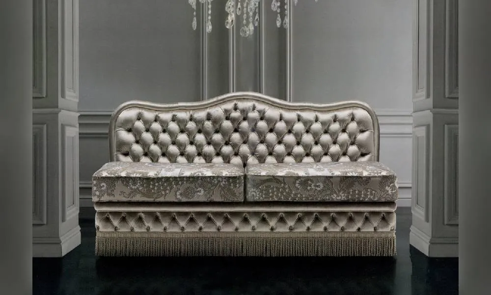 Диван-кровать. Украшен бахромой. Спинка и основание обиты в технике капитоне. Возможны другие варианты обивки, в том числе в ткани клиента.