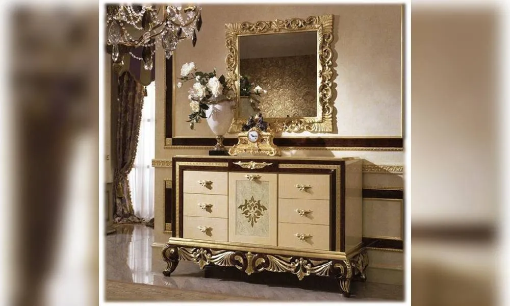 Комод с 6-ю ящиками и одной центральной дверцей, украшен резьбой. Дверца выполнена из окрашенного стекла с декорацией из золотой фольги. Декор ручной работы. Возможны другие цветовые варианты отделки.
