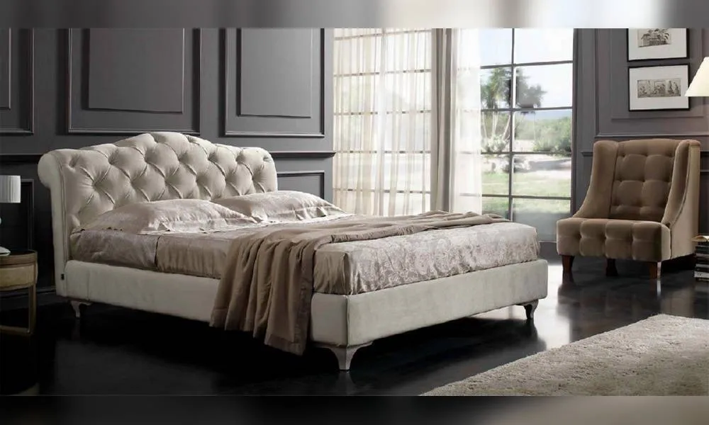 Двуспальная кровать с деревянными ножками, обитым основанием и обитым в технике капитоне изголовьем. Возможны другие варианты отделки и обивки.