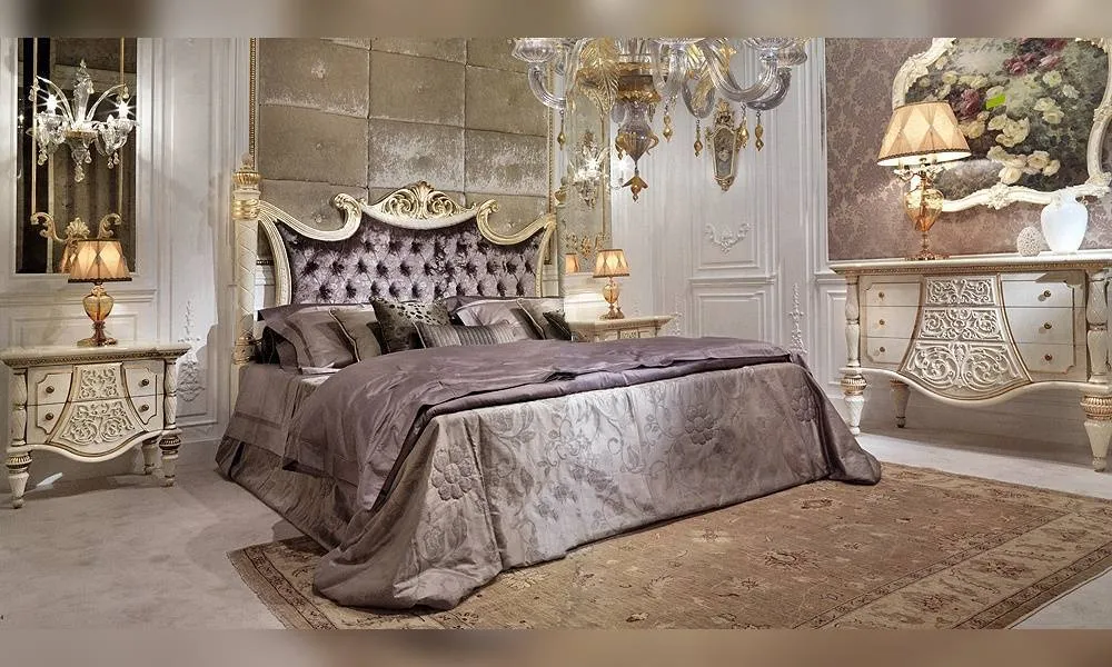 Двухспальная кровать с высоким, мягким изголовьем. Декорирована резными элементами. Возможны другие варианты отделки и обивки.