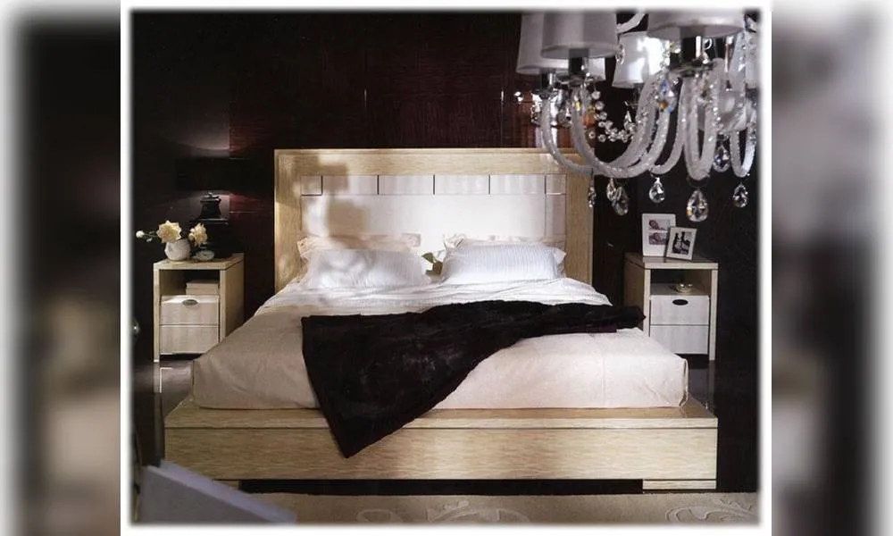 Двуспальная кровать с высоким изголовьем, без изножья. Декорирована кожаной аппликацией. Декор ручной работы. Возможны другие цветовые варианты отделки и кожи.