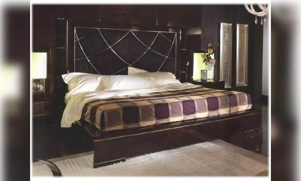 Двуспальная кровать. Высокое и мягкое изголовье с хромированными металичискими вставками, без изножья. Декор ручной работы. Возможны другие цветовые варианты отделки и обивки.