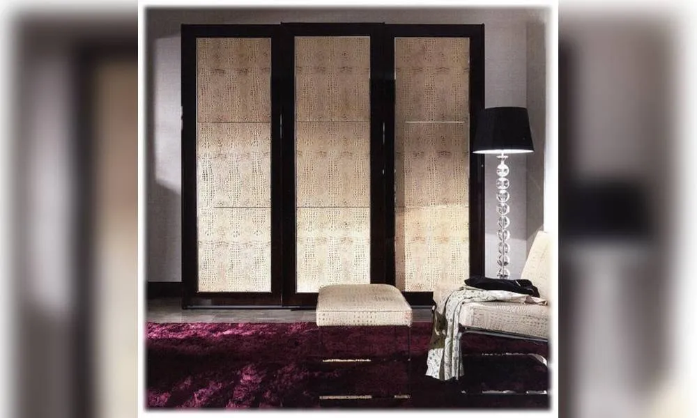 Шкаф с 3-мя раздвижными дверями декорированные кожей. Внутреннее оснащение: 3 деревянные полки и 4 вешалки. Декор ручной работы. Возможны другие цветовые варианты отделки и кожи.