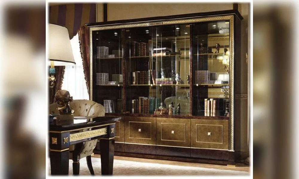 Стенка с 4-мя стеклянными дверцами. Верхние стеклянные дверцы с декоративной гравировкой. Зеркальные задние стенки. Внутренние стеклянные полки с декоративным латунным профилем. Галогеновая подсветка в верхней плоскости по желанию заказчика. Декор ручной работы. Возможны другие цветовые варианты отделки.