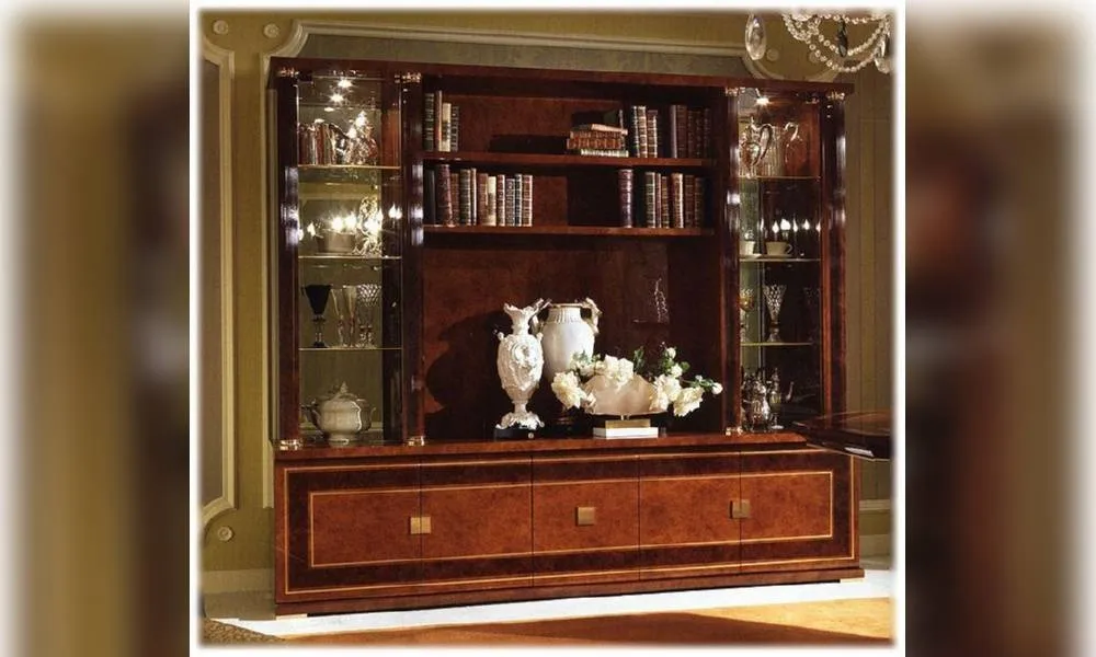 Стенка с 5-ю дверцами с центральной частью под TV. Верхние боковые части со стеклянными дверцами. Зеркальные задние стенки. Внутренние стеклянные полки с декоративным латунным профилем. Галогеновая подсветка в верхней плоскости по желанию заказчика. Декор ручной работы. Возможны другие цветовые варианты отделки.