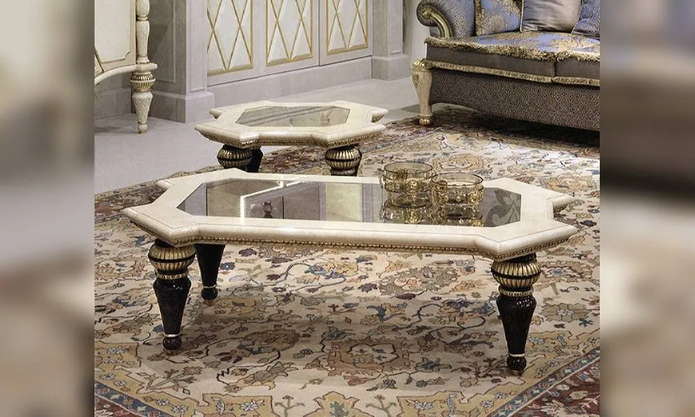 Прямоугольный журнальный столик. Декорирован резными элементами.