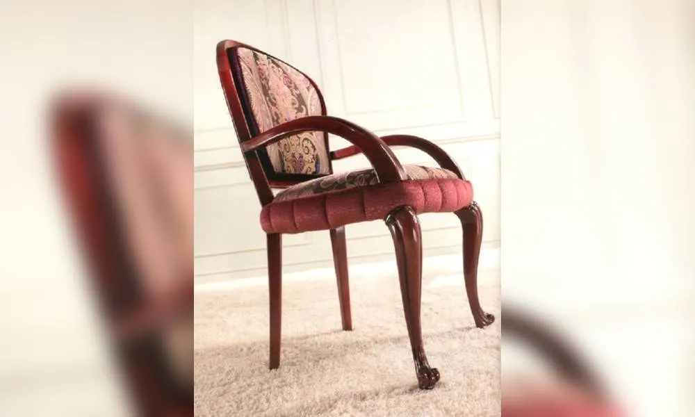 Стул с подлокотниками, мягкие сидение и спинка. Декорирован резными элементами. Наполнение - полиуретан. Возможны другие варианты обивки.