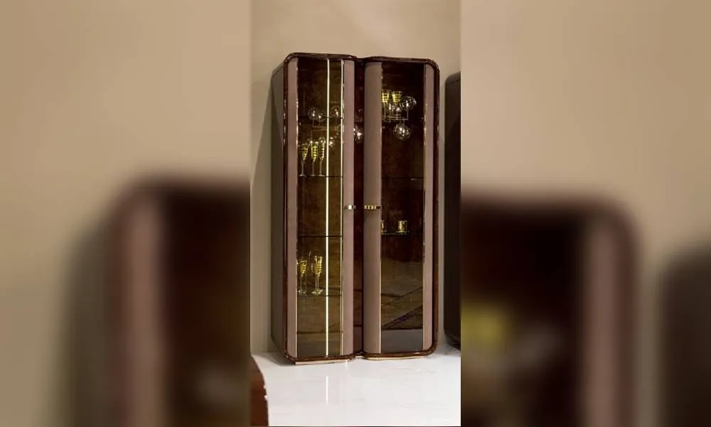 Витрина с 2 стеклянными распашными дверцами и деревянной пилястрой. Возможен вариант с внутренней подсветкой и другие варианты отделки и обивки.