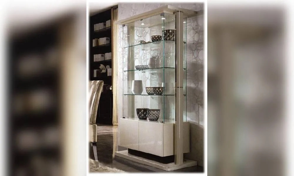 2-х дверная витрина. Зеркальная задняя стенка. Внутренние полки стеклянные. Галогеновая подсветка на верхней плоскости. Декор ручной работы. Возможны другие цветовые варианты отделки и декоративные элементы с аппликациями из кожи. Возможен вариант с зеркальной задней панелью.