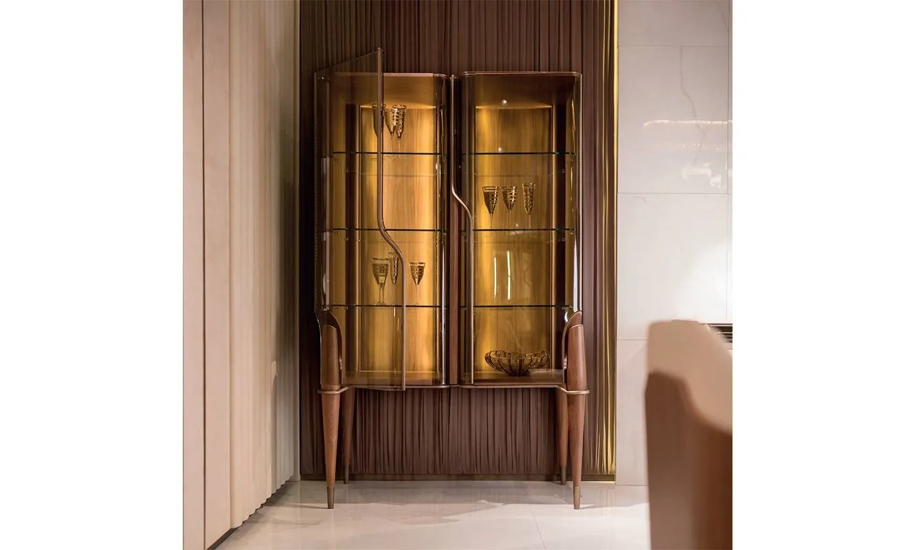 Витрина с двумя дверцами из закаленного стекла бронзового оттенка. Структура состоит из дерева, отделка - Черный орех. Детали выполнены из сатинированного металла бронзового оттенка. Есть подсветка. Одна из дверец может быть выполнена из дерева в кожаной обивке.