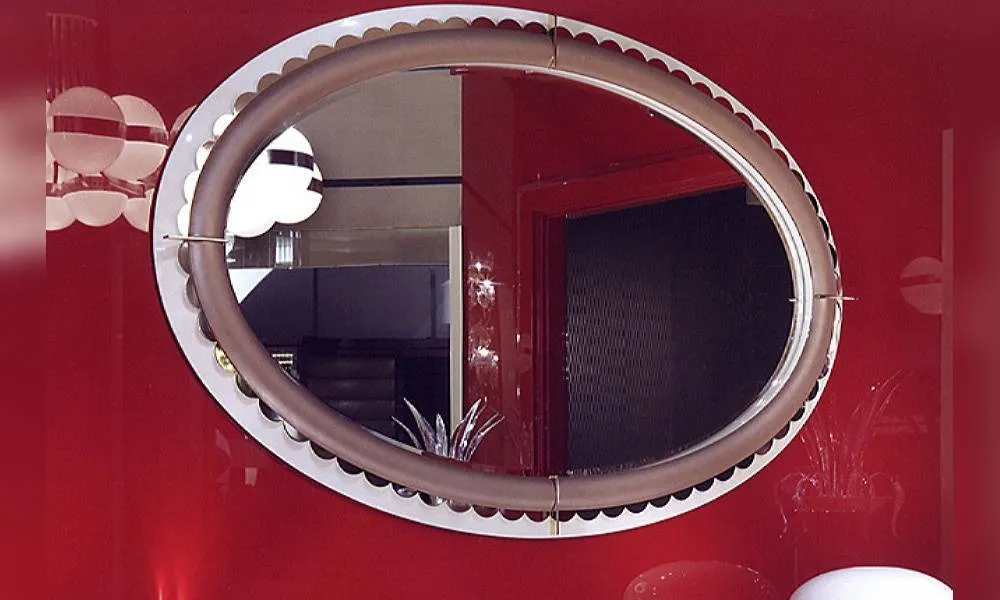 Овальное настенное зеркало. Украшено кожаными аппликациями. Возможны другие варианты отделки.